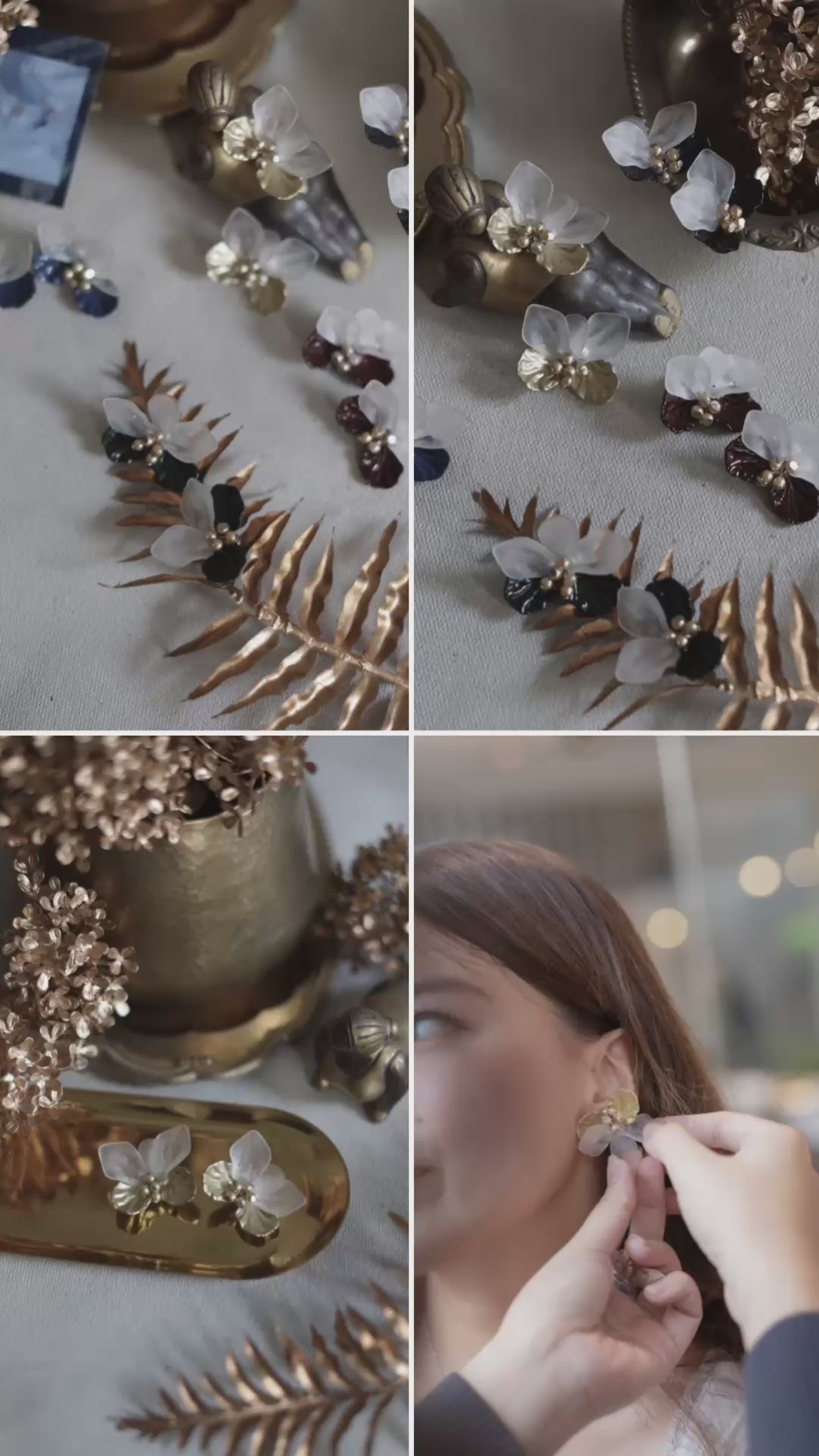 A quiet touch of elegance inspired by winter light. Lightweight acrylic-resin petals paired with a hypoallergenic stainless steel base, available in stud and clip-on options.